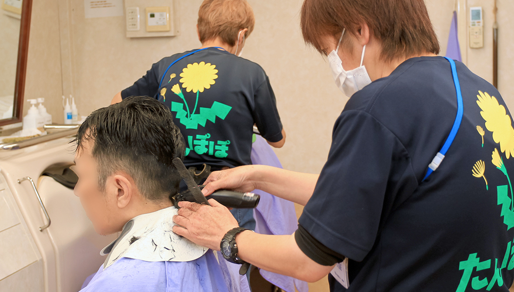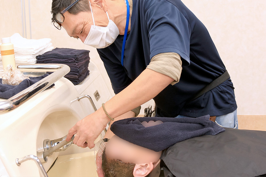 シャンプーなしのメニューの場合も、一度は髪を霧吹きで濡らし、必ずブローまで実施。万一体調が悪くなった場合は、職員や看護師をすぐにお呼びし、適切な処置を行います。