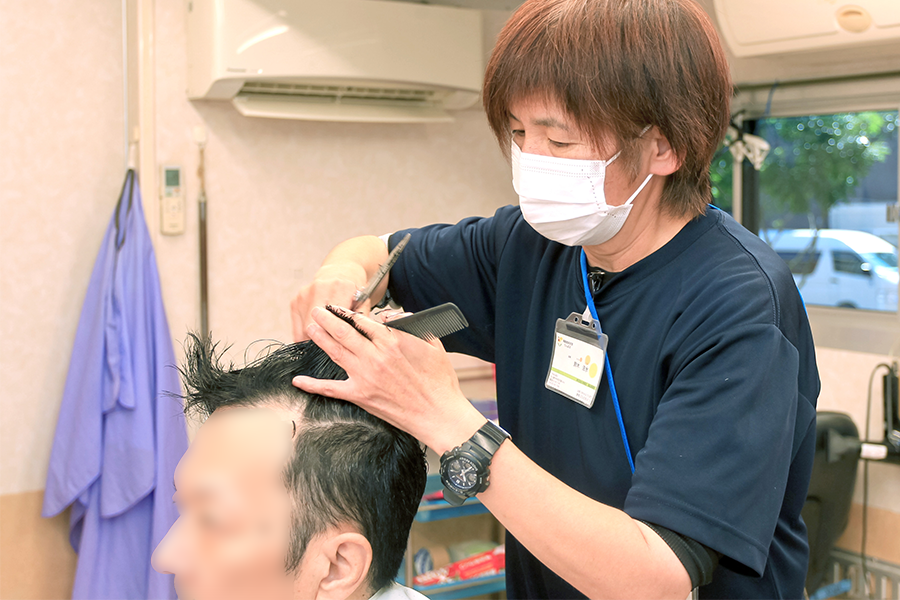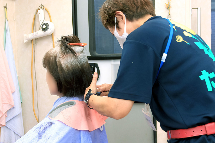 専用車の車内では、一般の美容室と同様の設備を使用して、プロフェッショナルな施術を行います。